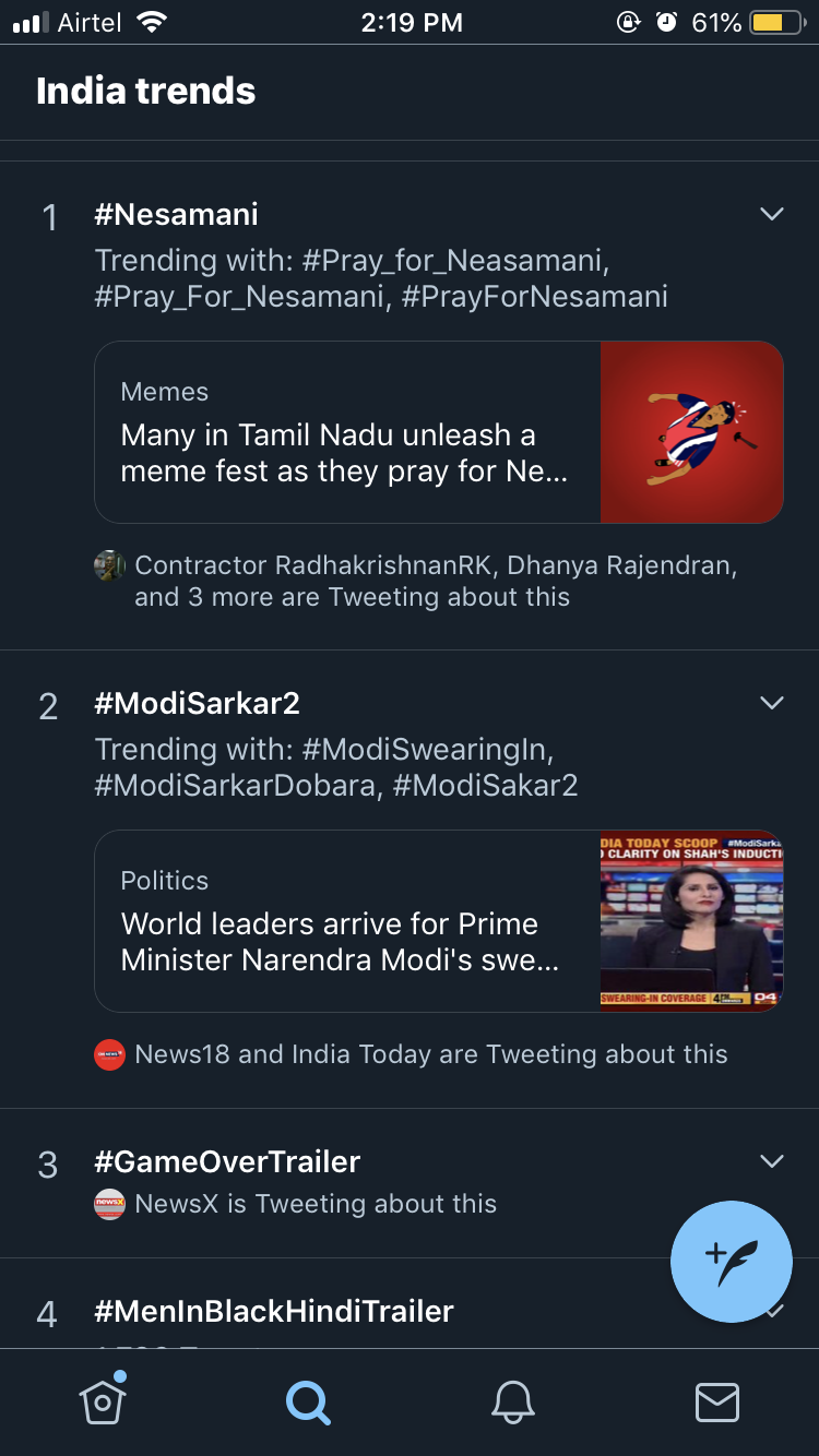 #Pray_for_Neasamani over took #ModiSarkar2 considering that today is the swearing-in-ceremony of Prime Minister Narendra Modi. Many on Twitter asked the Centre to cancel the ceremony to show their respect to Neasamani.